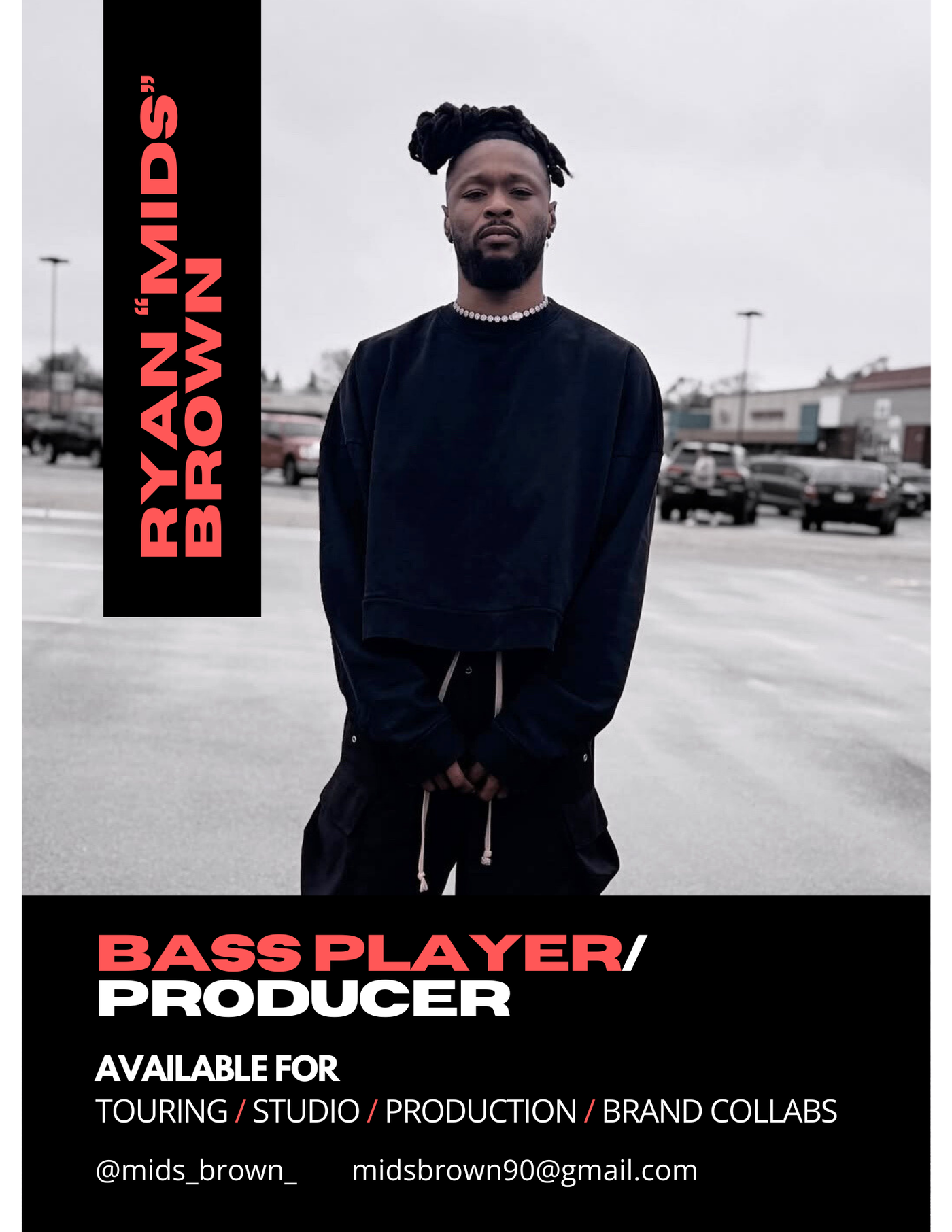 Ryan “Mids” Brown is a genre-fluid bassist known for his signature tone, deep pocket, and undeniable presence both on stage and in the studio. Based in Milwaukee, WI, Mids has built a reputation as a dynamic, in-demand musician, fusing gospel, R&B, funk, and pop into a sound uniquely his own.