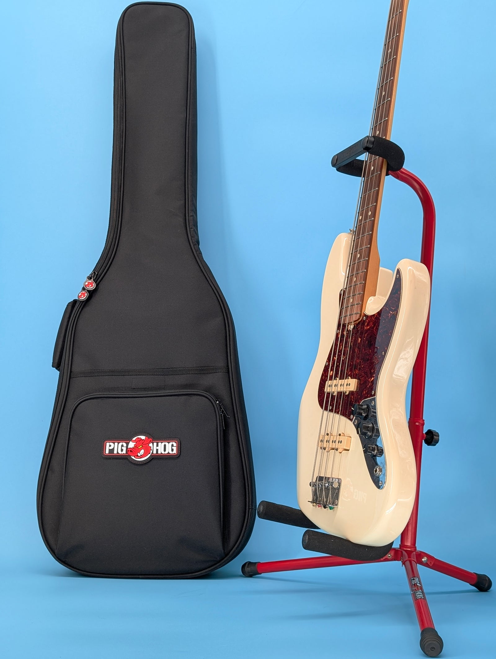 The Pig Hog has your back with the GigPig gig bag! Carry your guitar to the gig with the padded ergonomic shoulder straps, or grab the comfortably padded handle wrap. The 600D polyester exterior is durable and abrasion resistant, and the custom molded zipper pulls add a bit of functional flair. A Velcro slip pocket provides quick access, while the zippered front pocket features an organizer with space for all your accessories. Double layer foam padding throughout the bag protects your instrument, while string protectors at the head stock and bridge protect the bag. Don't get bogged down in transit with your gear, grab a hold of a GigPig gig bag!